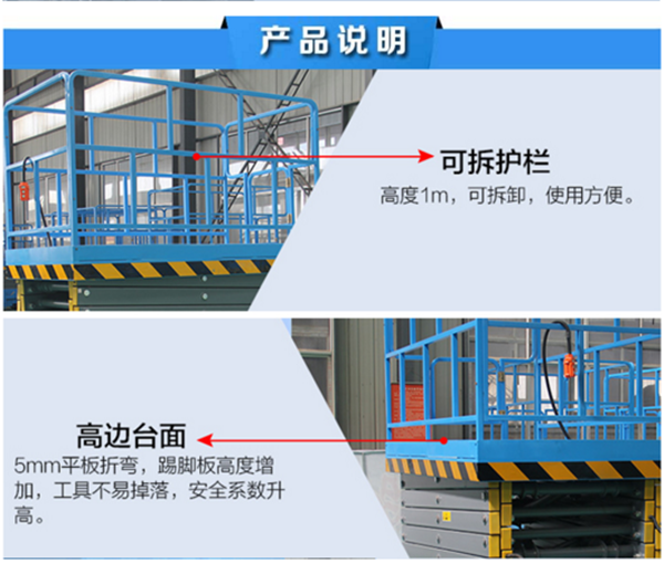 升高4——22米,載重0.3—3噸。采用意大利和國產液壓泵站,臺面使用防滑絕緣扣板,具有防滑,絕緣、安全,請放心使用。它使高空作業效率更高,安全更保障。