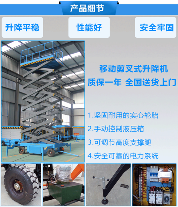 移動式升降機是用途廣泛的高空作業專用設備。移動式升降平臺的剪叉機械結構,使升降臺起升有較高的穩定性,寬大的作業平臺和較高的承載能力,使高空作業范圍更大、并適合多人同時作業。